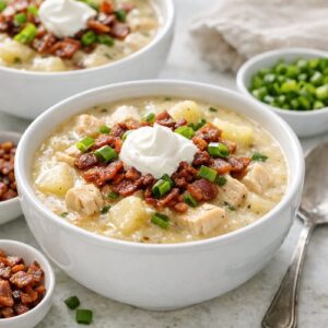 Great question—this recipe uses chicken broth (the “baked potato chicken soup” name refers to pairing it with chicken or the chicken broth base), but there’s no actual chicken meat included. If you want to make it a true chicken and potato soup, you can add 1.5 cups of diced cooked chicken breast or rotisserie chicken with the potatoes in Step 6. The protein content increases significantly, and it becomes even more of a complete meal. Add the chicken only at the end so it just heats through rather than getting tough.