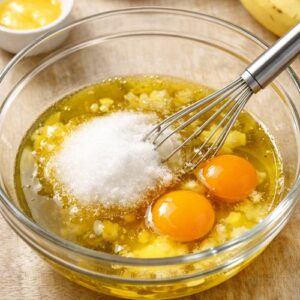 - In a large bowl, combine the olive oil, melted butter (make sure it's cooled to just warm, not hot—hot butter will cook the eggs), granulated sugar, and brown sugar. Using a whisk, beat for about 1 minute until the mixture is smooth and the sugar begins to dissolve. You should see a slight lightening in color as you incorporate air. Add the eggs one at a time, whisking well after each addition. This is where emulsification begins—the eggs are binding the oils and fats together, creating a stable base. Whisk for about 2 minutes total until the mixture becomes pale and noticeably thicker.