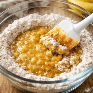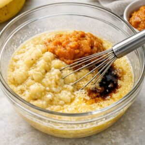 - Now we add the bananas, pumpkin puree, and vanilla extract to the egg mixture. Whisk until completely combined, about 1 minute. Make sure there are no lumps of pumpkin visible and the bananas are fully broken down. The batter should look smooth, creamy, and uniform in color—a beautiful golden-orange from the pumpkin.