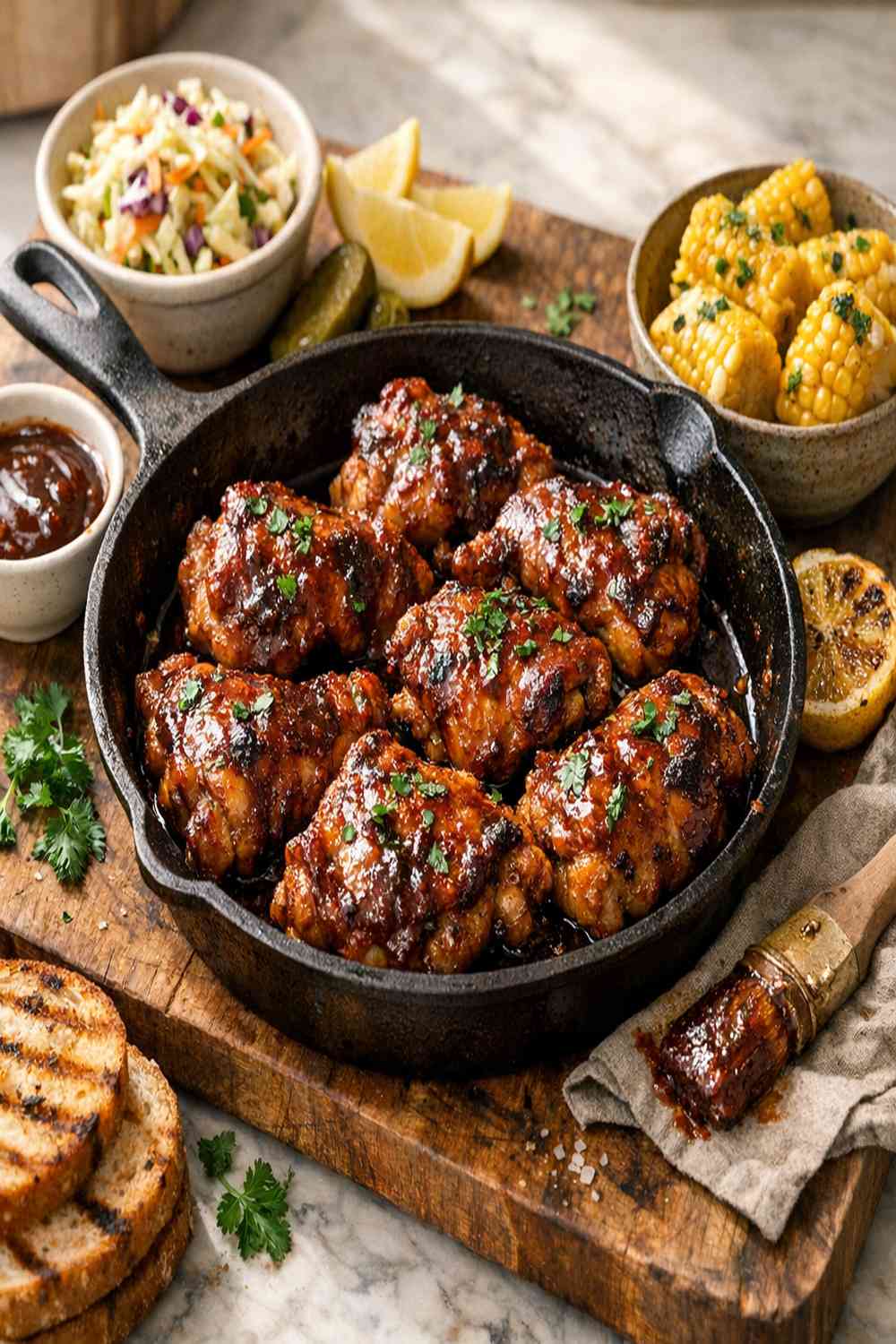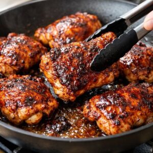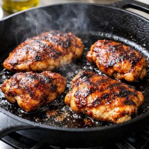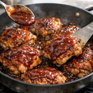 - Once your chicken reaches 165°F, pour half your barbecue sauce over the top of each thigh, coating generously. Flip the chicken over and pour the remaining sauce on the other side. If you're using honey or maple syrup, drizzle it now—it will help the sauce caramelize and create a glossy finish. Leave the skillet uncovered and cook for 2-3 minutes more, using a spoon or basting brush to continuously coat the chicken with the sauce. You'll see the sauce bubble slightly at the edges and cling to the meat. This final step creates the signature glossy, caramelized finish that makes this dish so visually appealing and delicious. The chicken should look glossy and deeply browned, almost glistening on the plate. This is your signal that the sauce has properly adhered and started to caramelize.