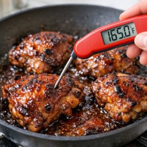 - Remove the cover and insert an instant-read thermometer into the thickest part of the thigh, avoiding bone. You're looking for 165°F (74°C) at minimum, though thigh meat stays wonderfully juicy even at 170°F. The juices should run clear with no pink at all when you pierce the thickest part. If your chicken hasn't reached 165°F yet, replace the cover and cook for another 2-3 minutes. Every stove is different, and factors like skillet thickness and burner power affect cooking time. Always trust the thermometer over timing.